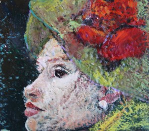 So I love to draw/paint people…so I wanted to see if I could use the texture and paint a woman…just a feeling/not a portrait. the red against the green on the ‘hat’ is pretty contrived but actually works I think…remember this is really just doing texture with LOTS of layers of wax….naming the wax in this instance as ‘woman’ but if you turn this painting upside down it is still stimulating